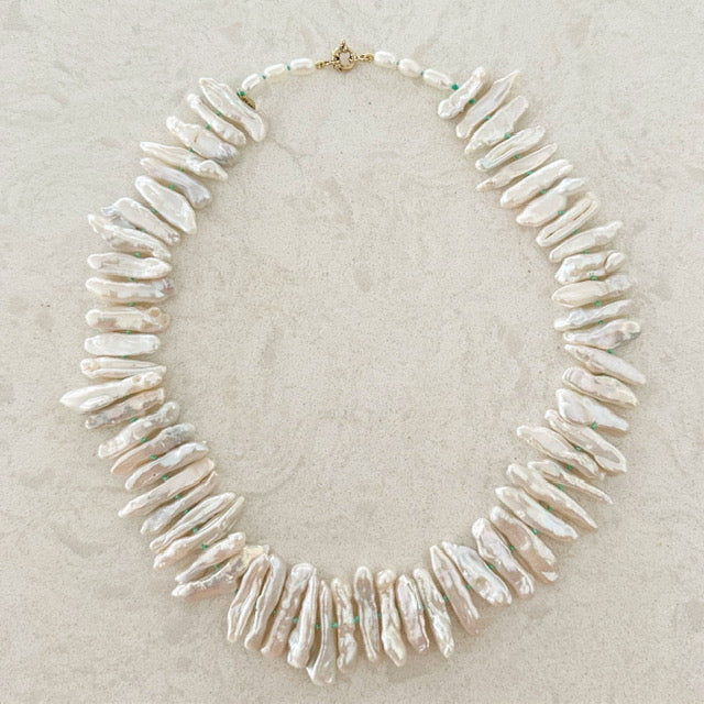 Shop pearl necklaces — in stock and ready to ship today — handcrafted in small batches in the Florida Keys with ethically sourced cultured pearls, sterling silver, and 14K gold. Each design celebrates the enduring beauty of pearls — a symbol of sophistication, grace, and meaningful moments. From classic freshwater chokers to a luminous Biwa pearl necklace and dramatic baroque pearls, every necklace is created to be an heirloom, treasured for generations.